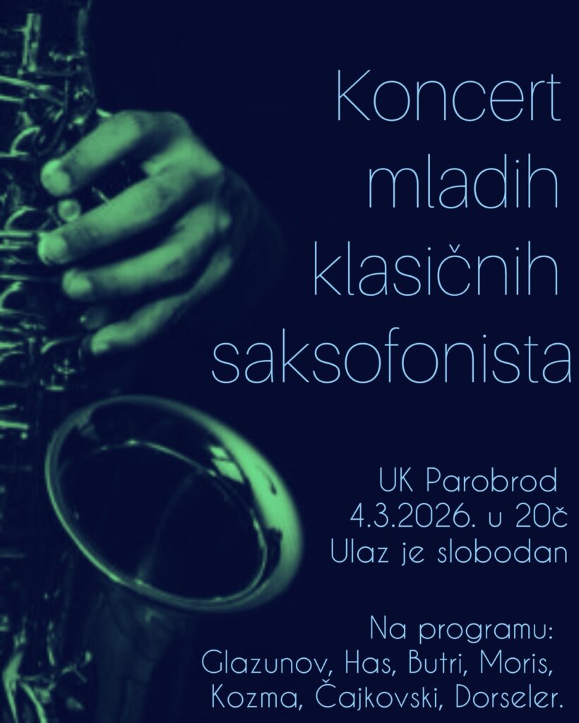On Wednesday, March 4th at 8 PM, UK Parobrod hosts a wonderful evening dedicated to young and promising classical saxophonists from Serbia. Entry is free, and the program is rich β€” featuring works by Glazunov, Has, Butri, Moris, Kozma, Tchaikovsky, and Dorseler.